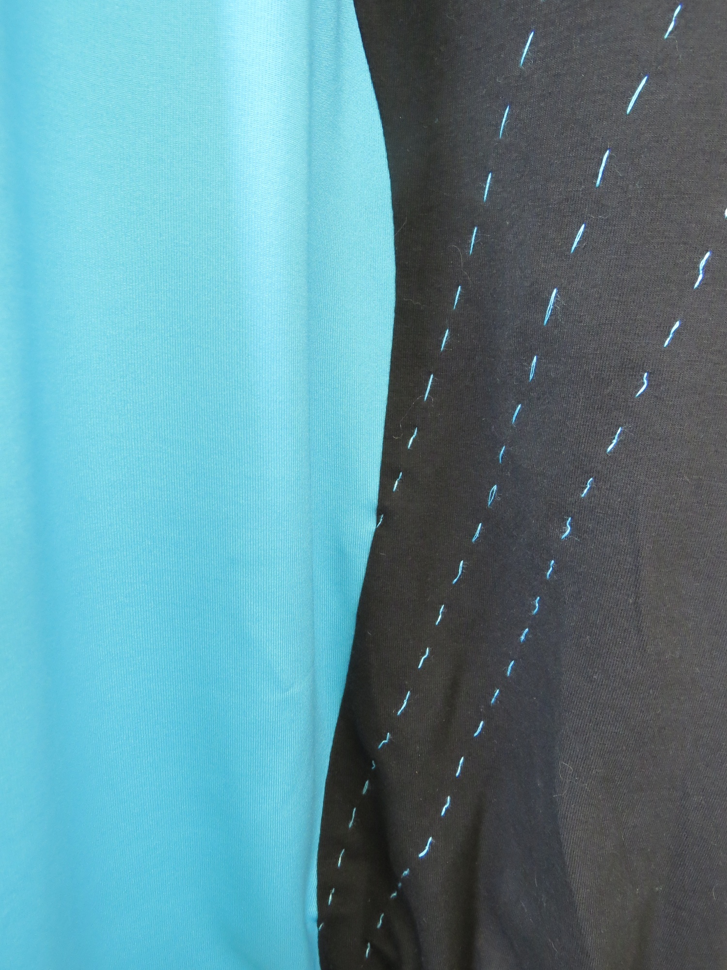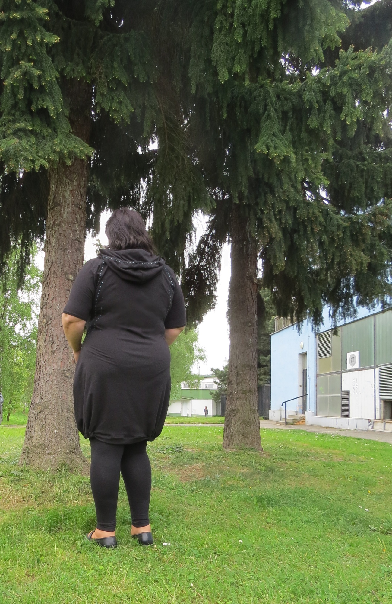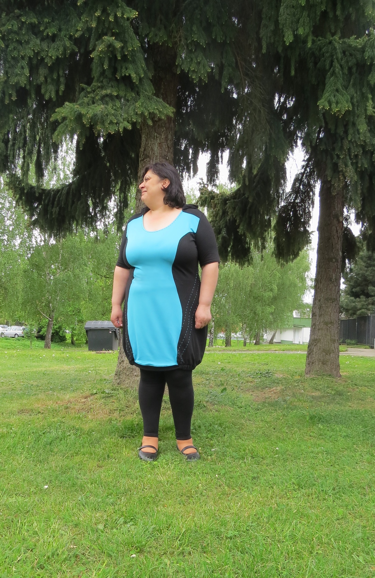 Návrh a realizace halenkových šatů z úpletových materiálů. Hlavní myšlenkou celého modelu je propojení výrazné barvy s tradiční černou pomocí ručně šitých linií. Šaty jsou navrženy tak, aby klientku opticky zužovaly a vytvořily jí krásnou ženskou siluetu. Ručně šité linie jsou použity tak, aby pocit ženskosti ještě více podpořil. Šaty jsou ve spodní části v bocích lehce staženy do pruženky také z již zmíněného důvodu. Celý model je doplněn o kapuci a podporuje tak více osobnost klientky.