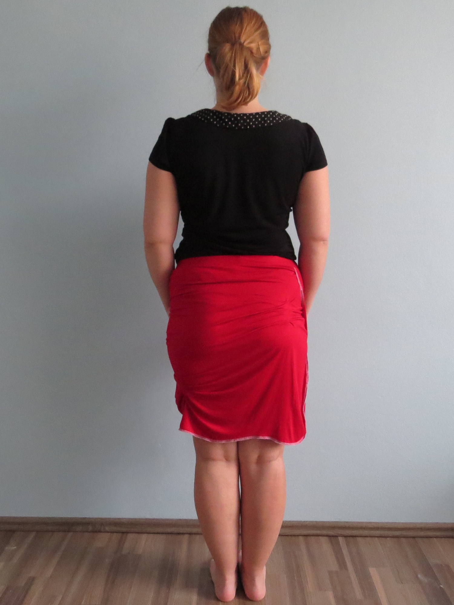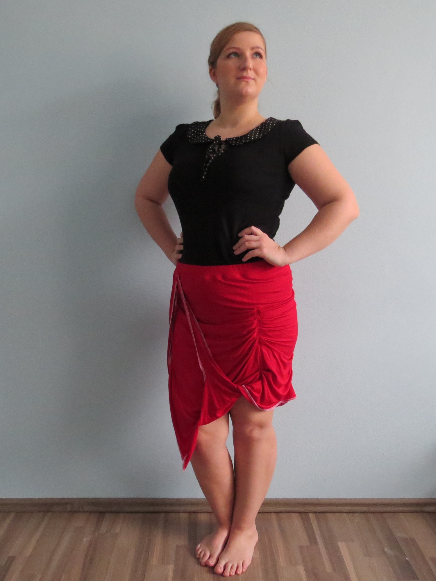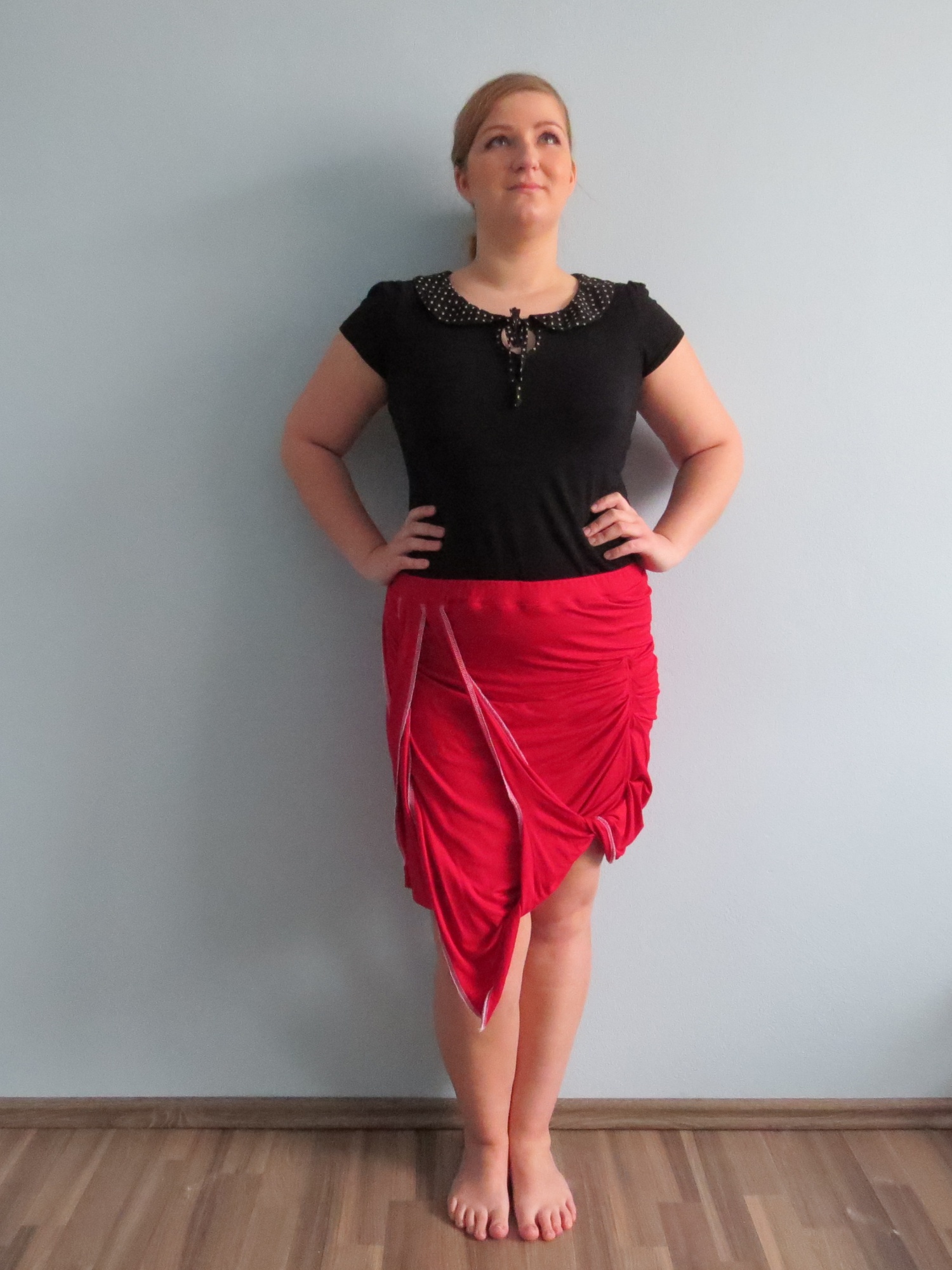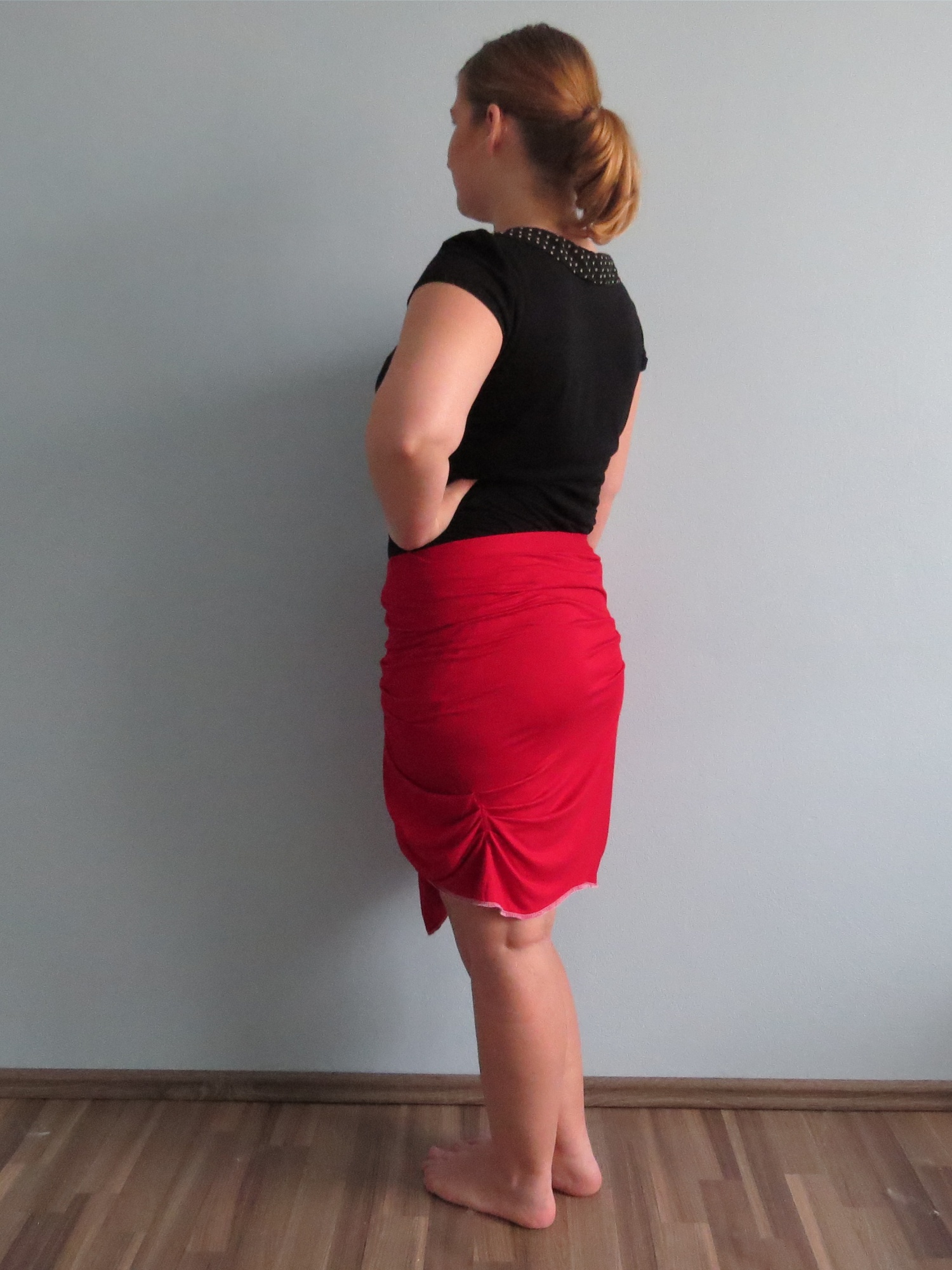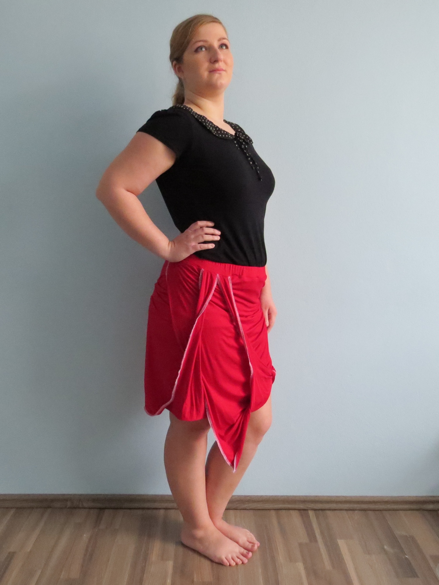 Sukně z úpletového materiálu 94% viskóza a 6% spandex (FUNKČNÍ TEXTILIE) červené barvy. Model je asymetrického střihu. Je založena na myšlence zavinovací sukně, její jednoduchost je ale přerušena překřížením částí sukně a občasným nařasením. Vše je kompozičně vyrovnáno a vytváří dokonalý celek.