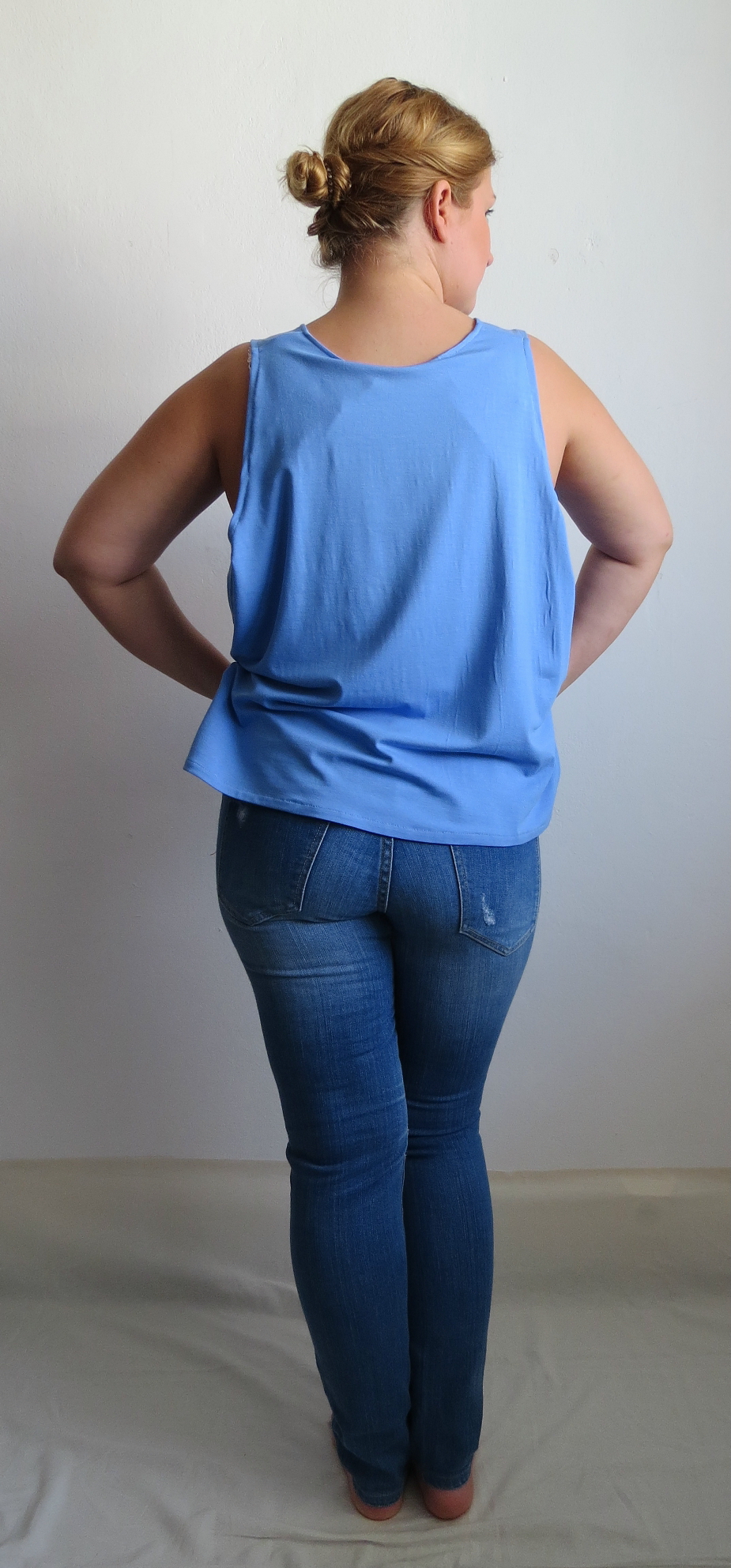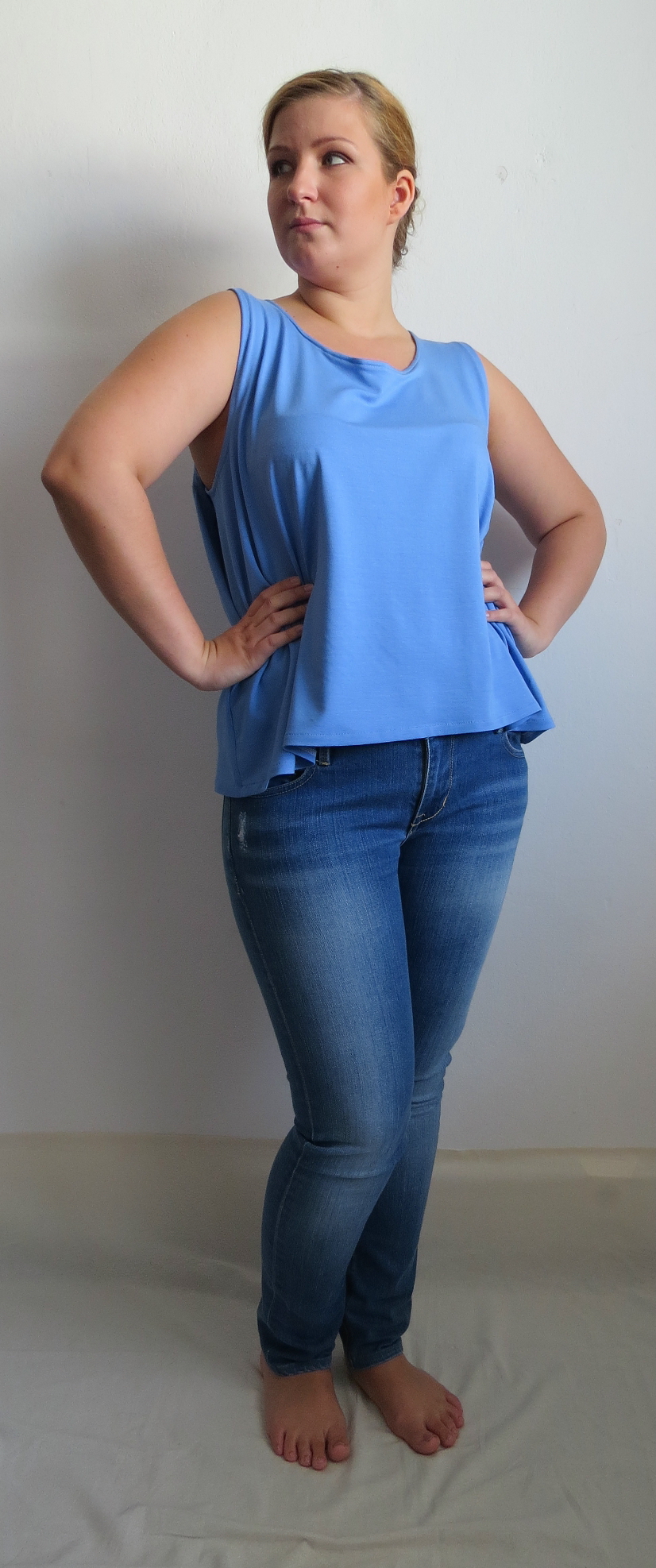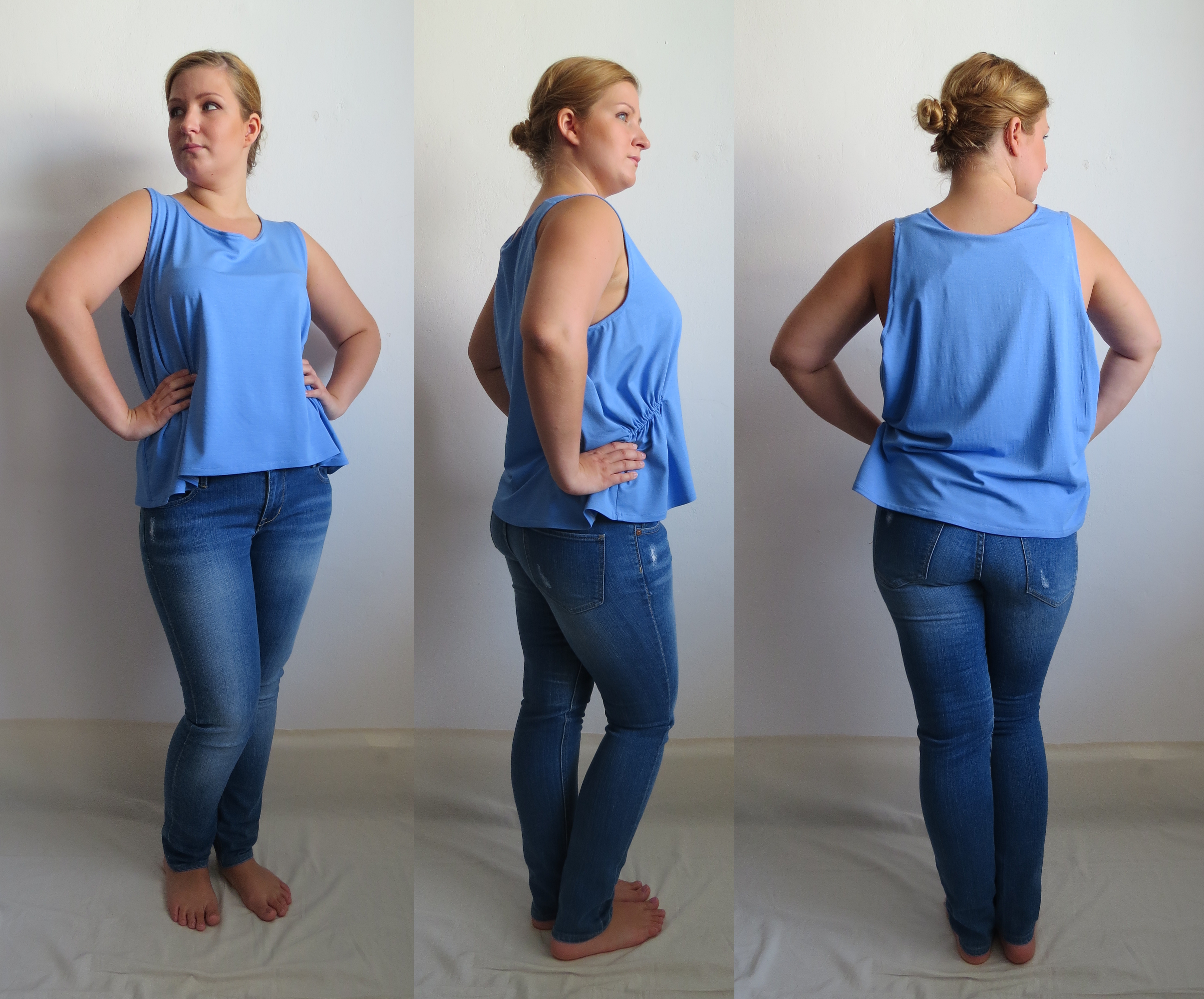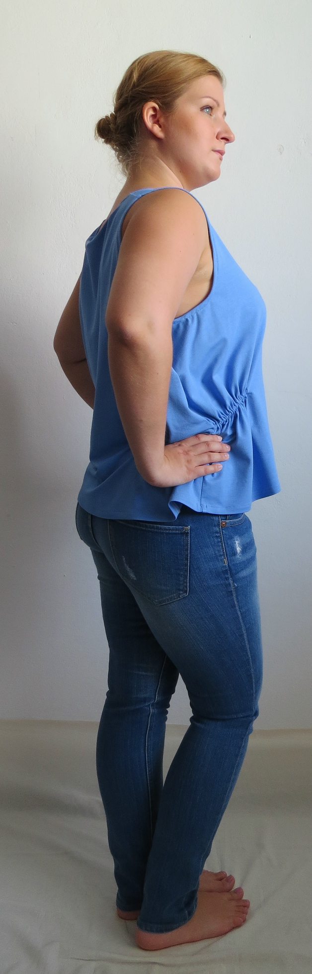 Halenka z úpletového materiálu 94% viskóza a 6% spandex (FUNKČNÍ TEXTILIE) krásně modré barvy. Oděv je zajímavého symetrického střihu. Přední díl je rozšířen o další průramek s ramínkem a zakomponován tak, aby vytvářel promyšlený a rafinovaný střih. Dále se po bocích nachází lehké nařasení gumičkou.