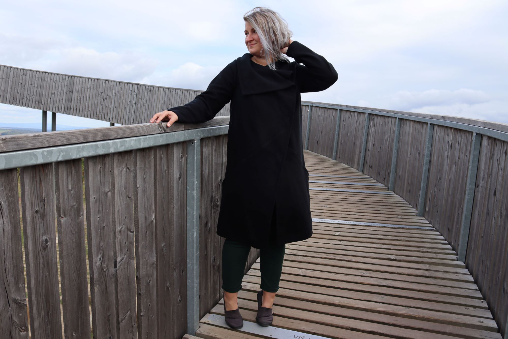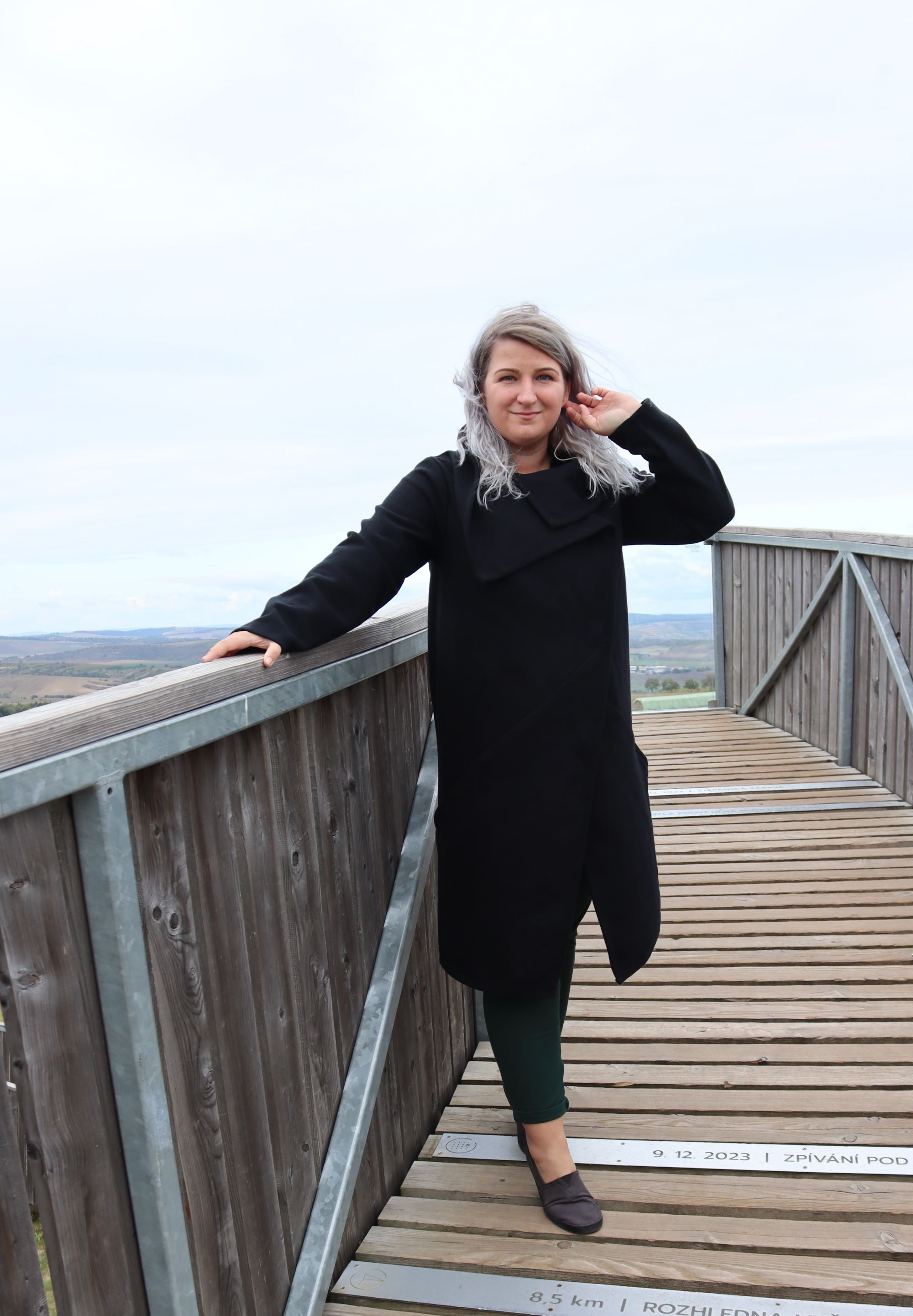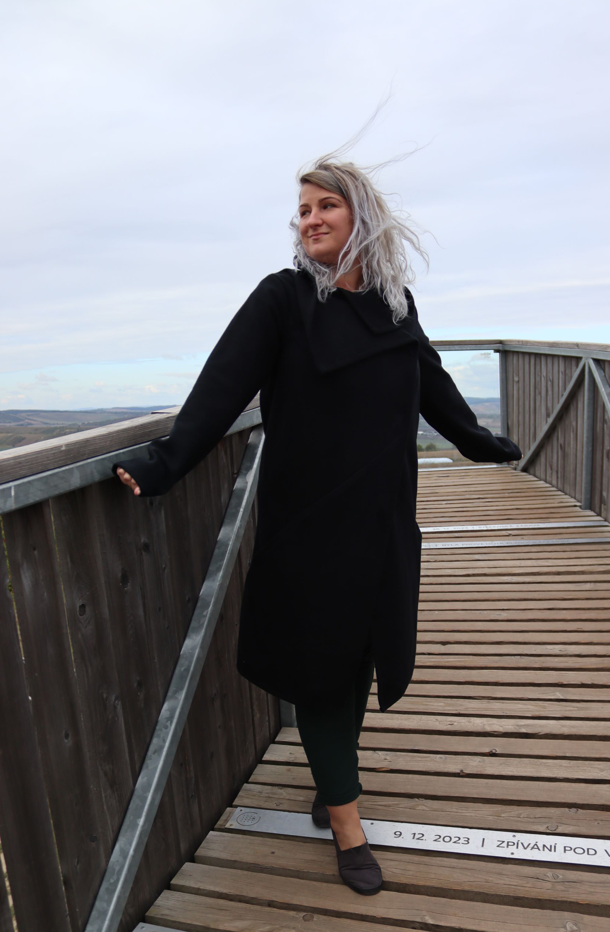 Klíčová slova: kabát V jednom kuse, dámský kabát, černý kabát, minimalistický kabát, kabát bez švů, česká móda, autorské oblečení, Veronika Ráčilová, elegantní kabát, ruční výroba, kabát na zakázku, podzimní kabát, lehký zimní kabát