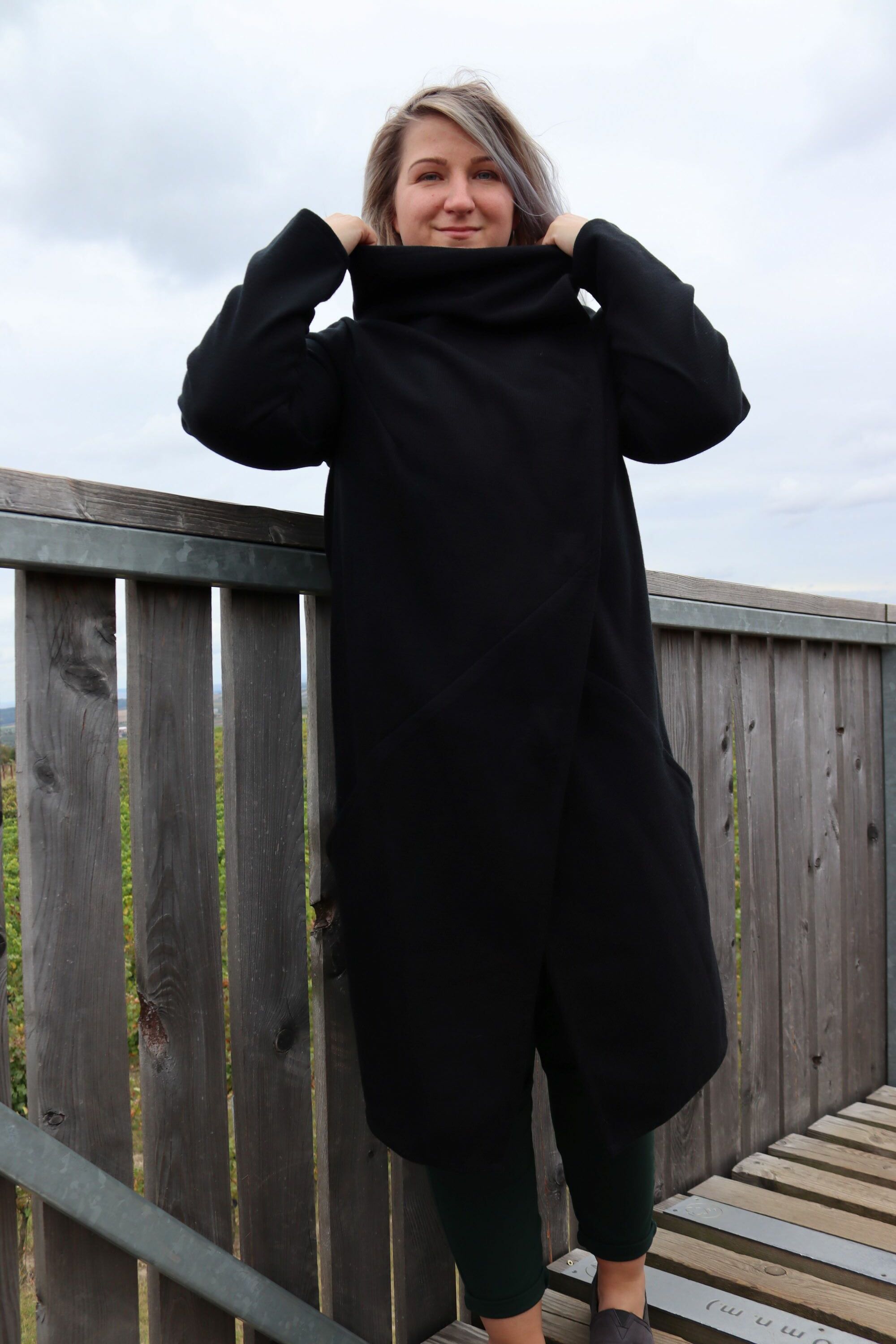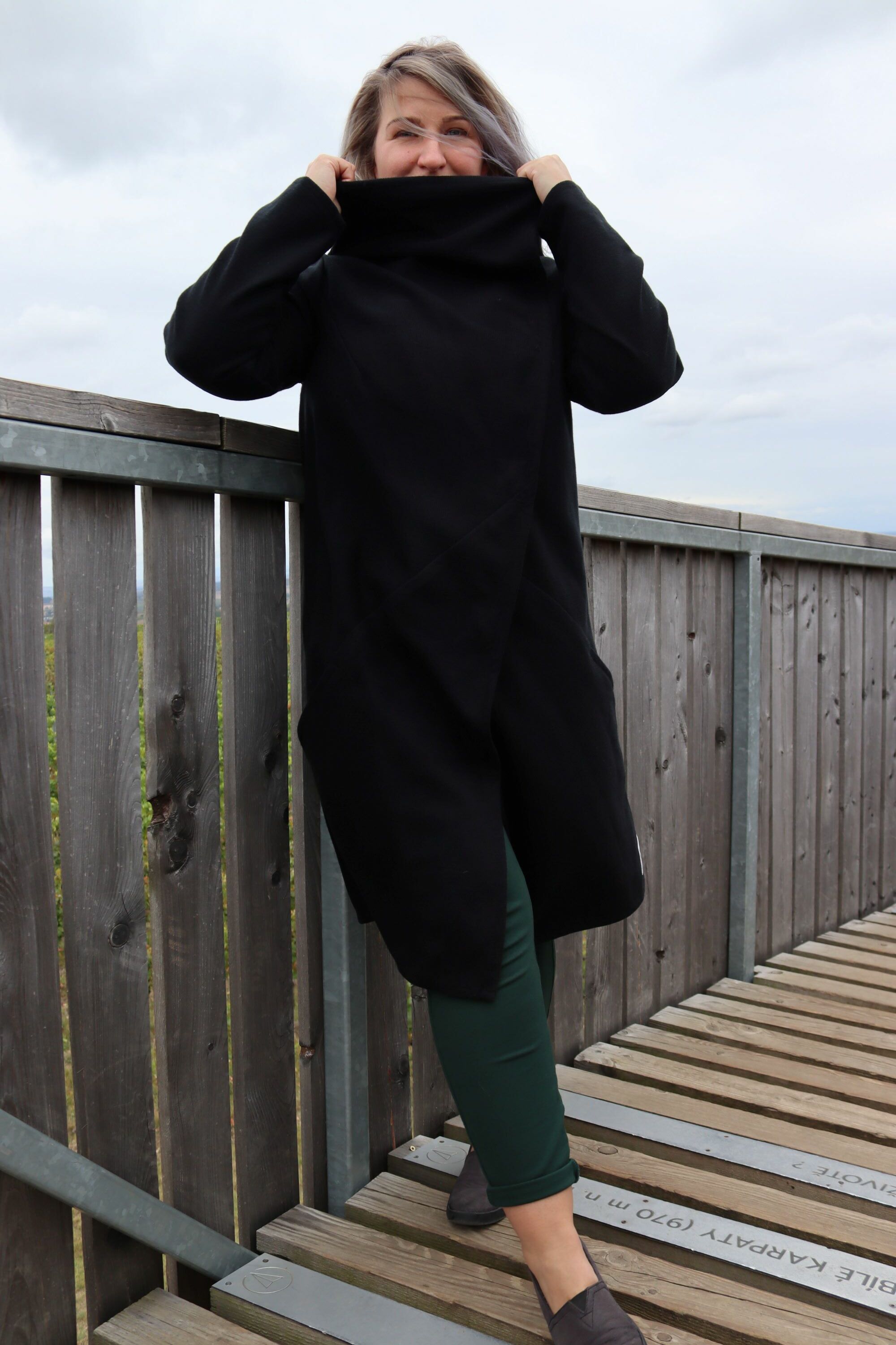 Kabát V jednom kuse je ideální pro podzimní i lehce zimní dny – snadno se obléká, krásně sedí a působí elegantně i v naprosté jednoduchosti. Stačí jej jen přehodit přes sebe a vyrazit. Celý v černé. Celý váš.