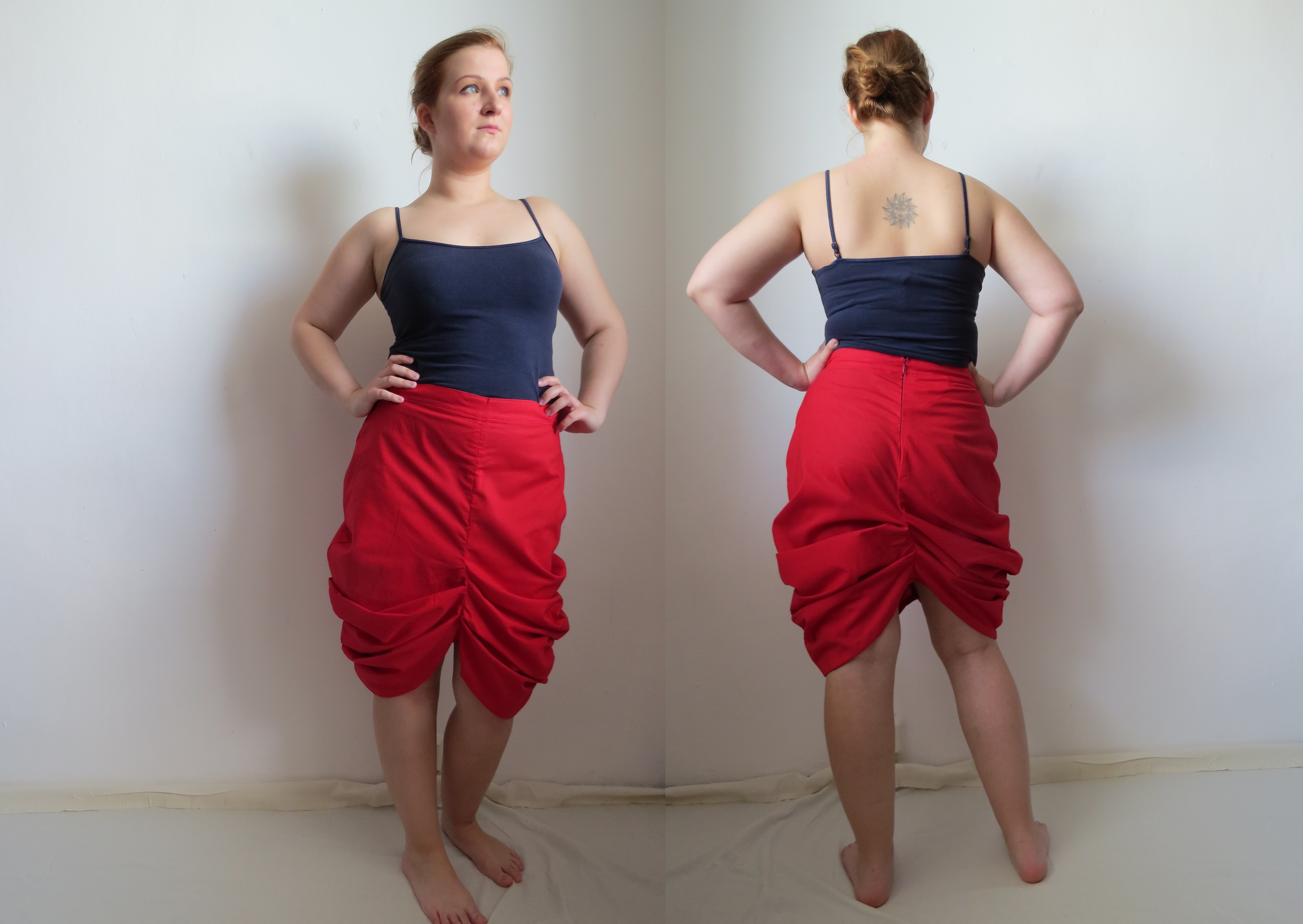 Sukně z přírodního materiálu 100% bavlny červené barvy. Model je symetricky střižen, ale přesto může vždy působit jinak a mírně asymetricky. Jednoduchost sukně přechází do příjemného nařasení, které vznikne při oblečení. Zdrhovadlo (zip) se nachází na zadním díle a umožňuje tak pohodlné oblékání.