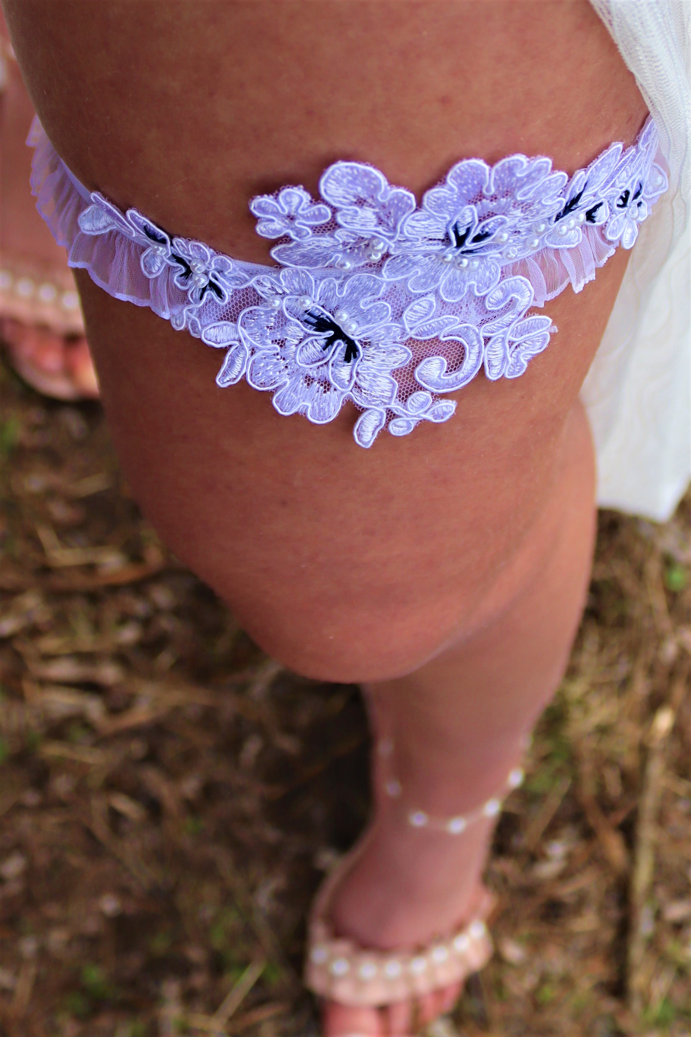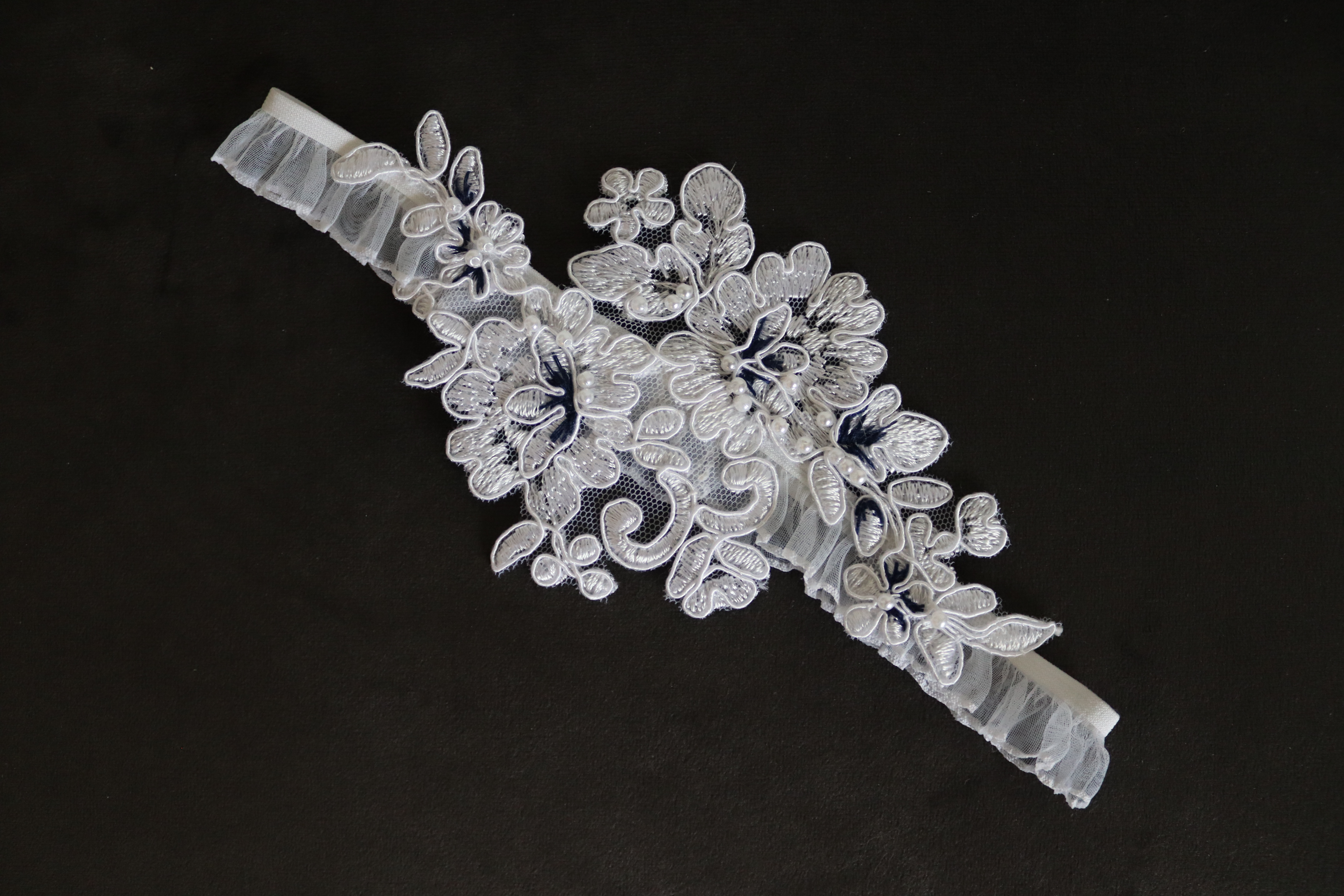 Krajkový květinový podvazek s vyšitými modrými detaily připomínající lehké tahy štětcem obohacen o malé perličkové korálky. Jemná pruženka (gumička) s kanýrkem doplňuje celý vzhled. Lze ji ale vyměnit za hladkou pruženku s nastavitelnou velikostí, vše dle Vašeho přání.
