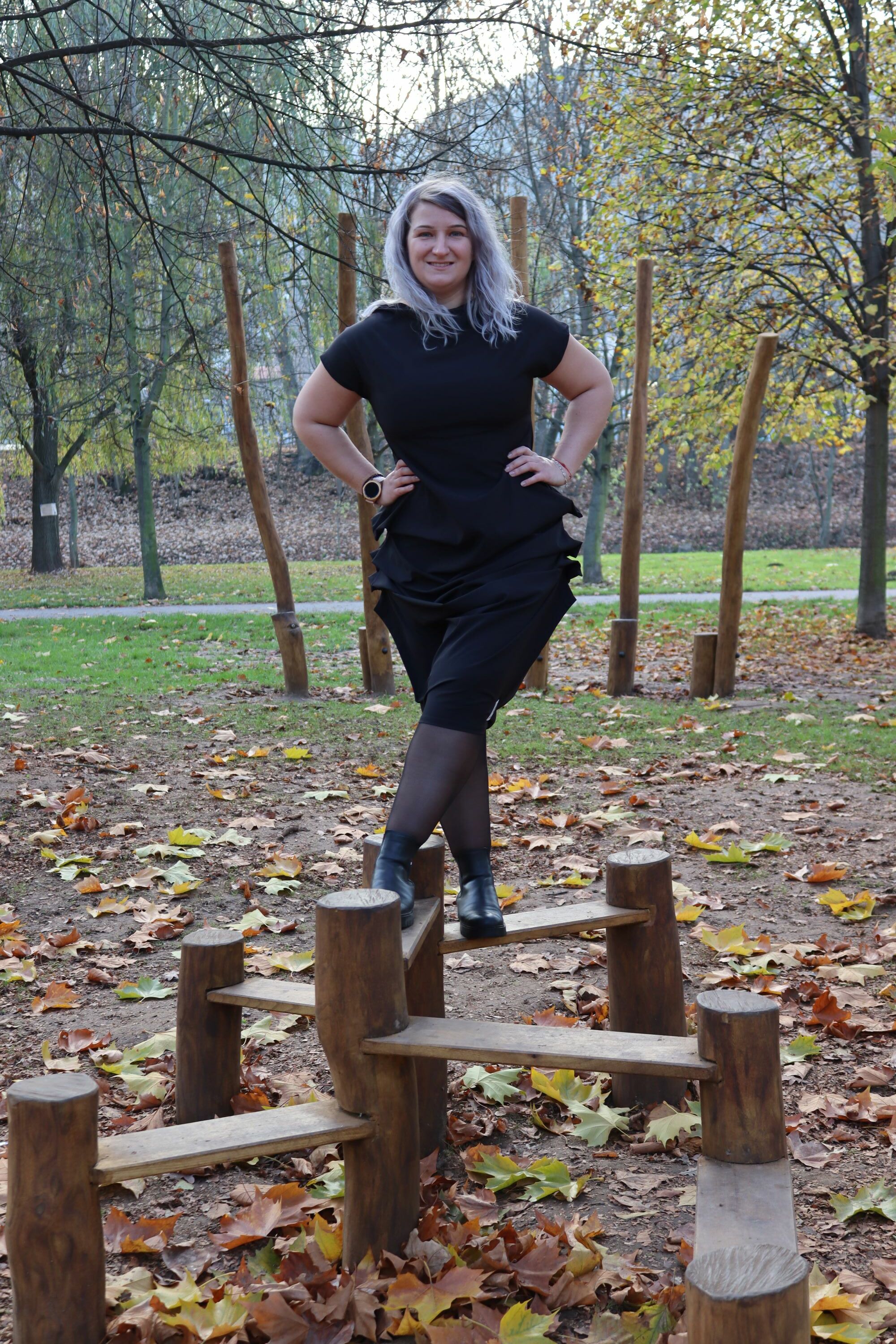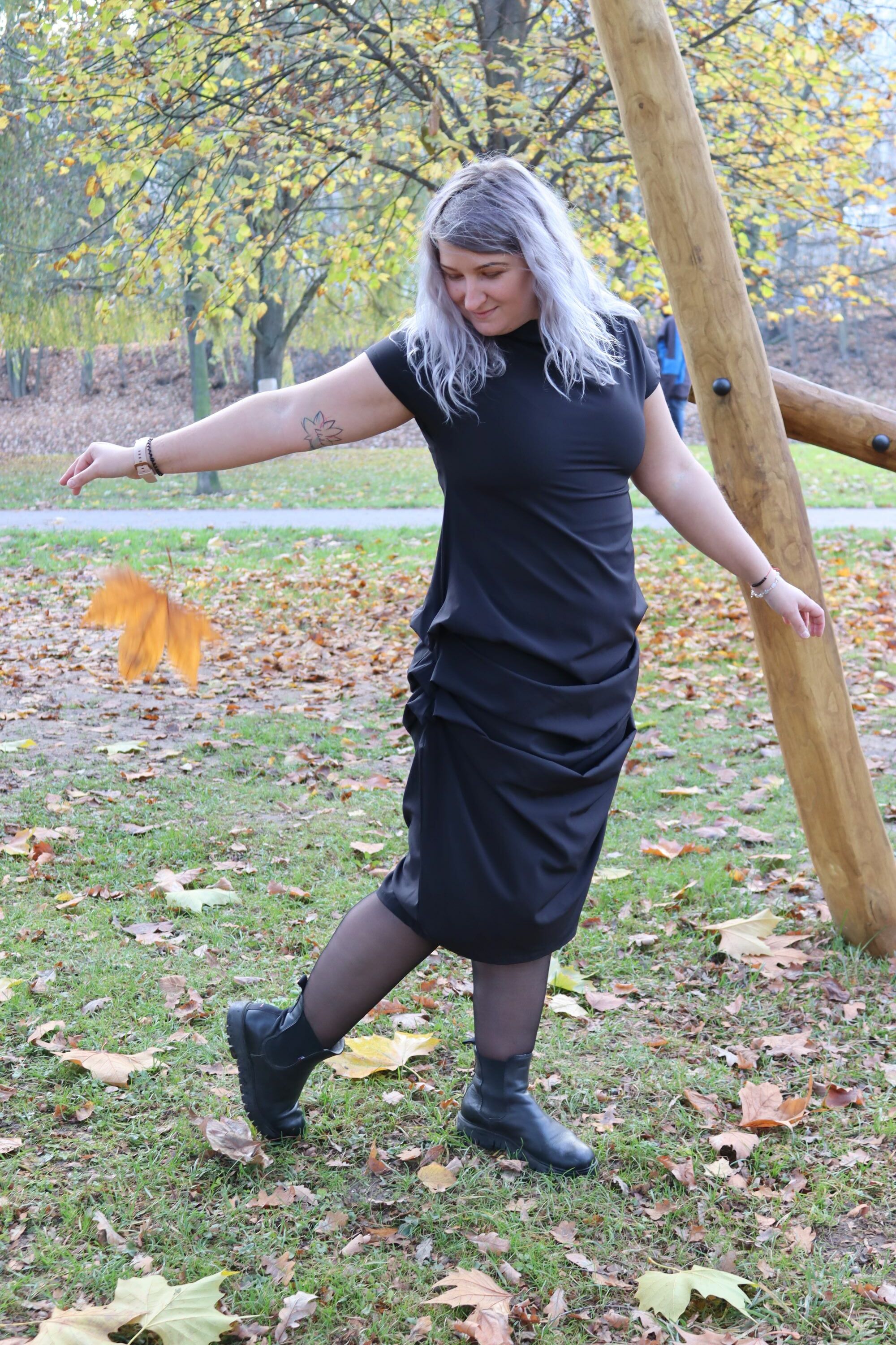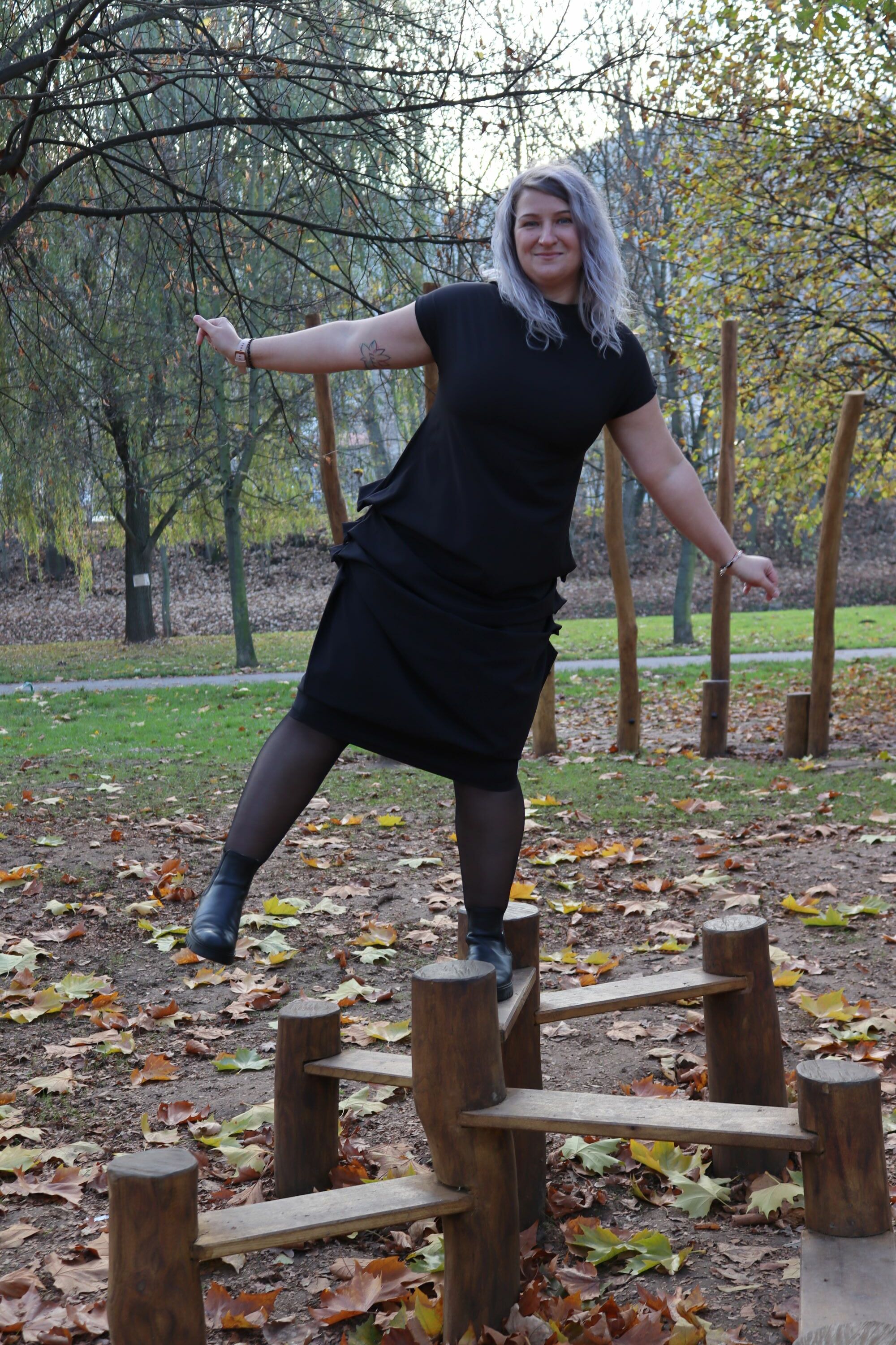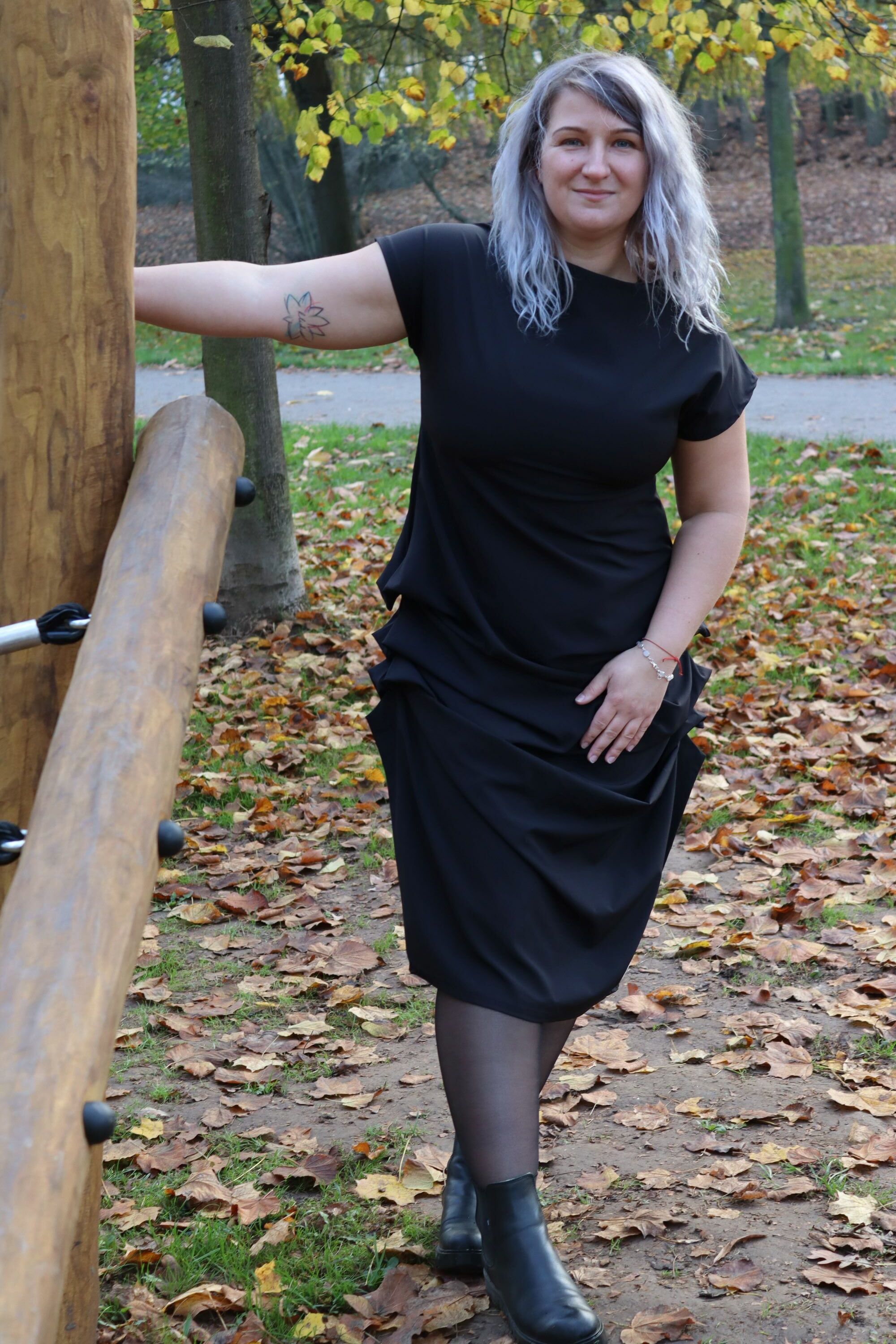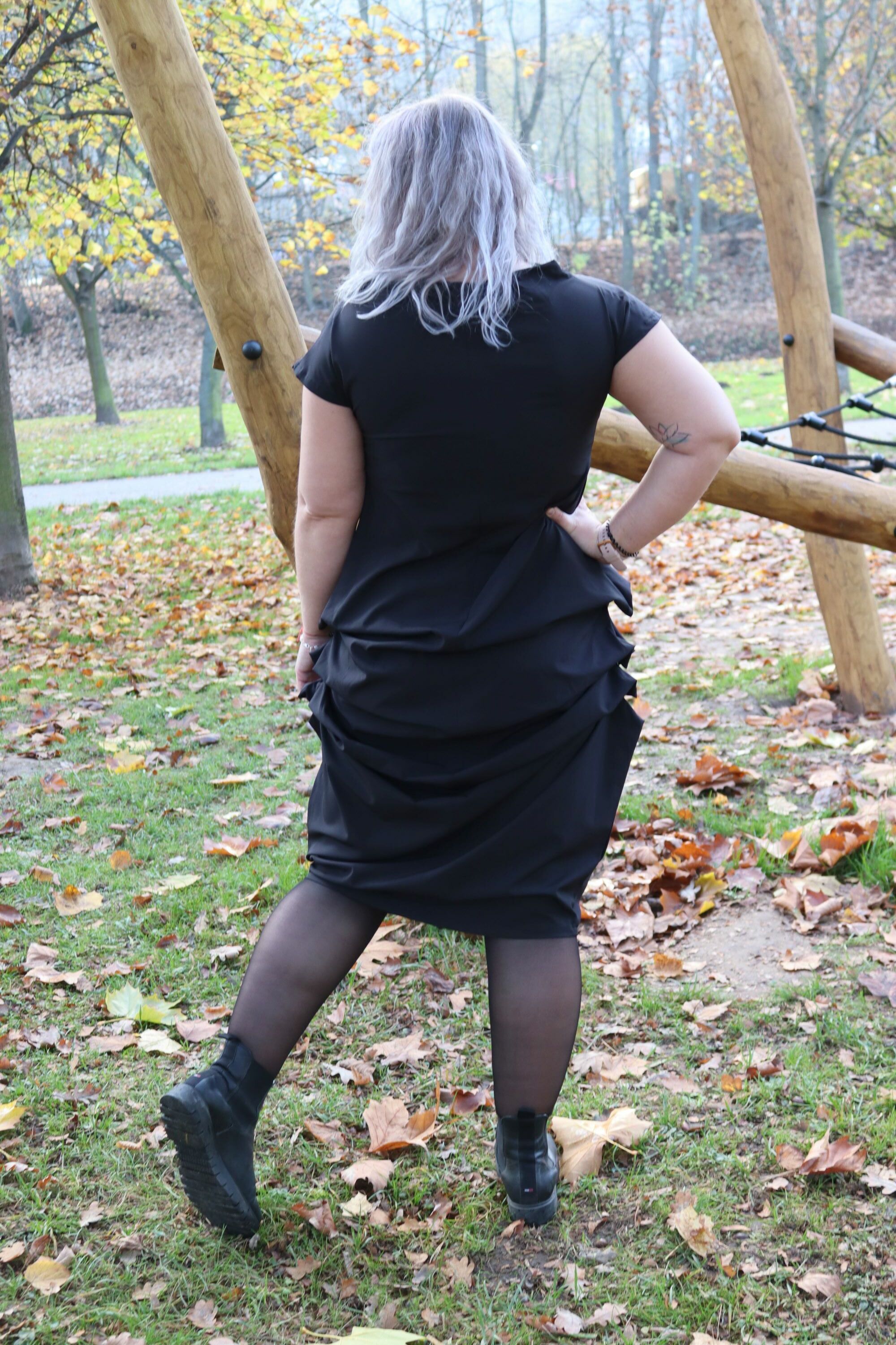 Designové černé šaty se střapci, které zaujmou originálním zpracováním a precizním střihem. Kombinují eleganci s hravým detailem – drobné sklady a spadlý rukáv dodávají modelu osobitost i pohodlí. Autorský návrh, ruční výroba v České republice z kvalitních materiálů.